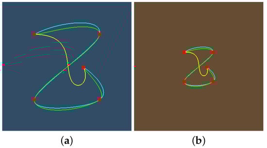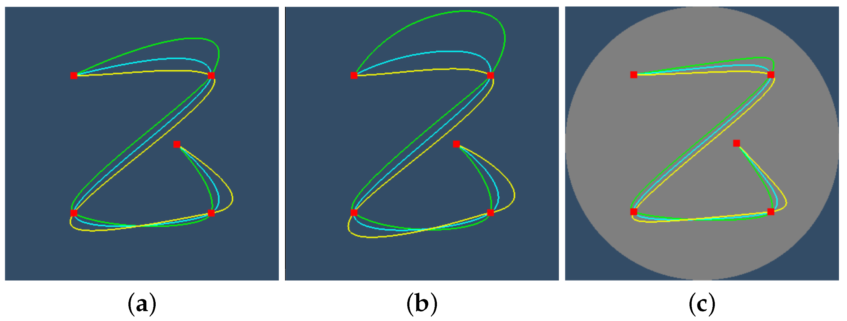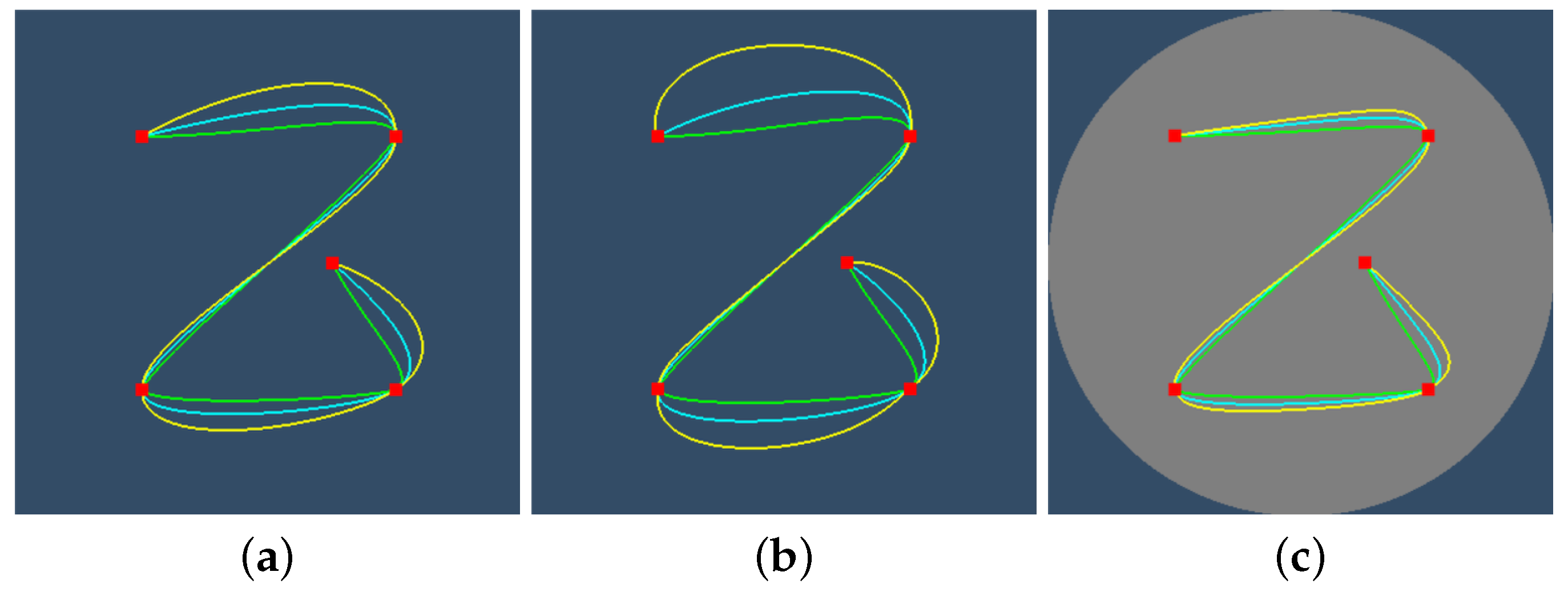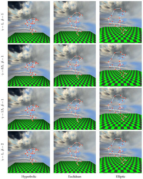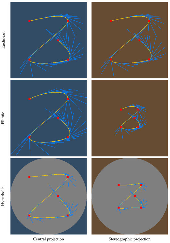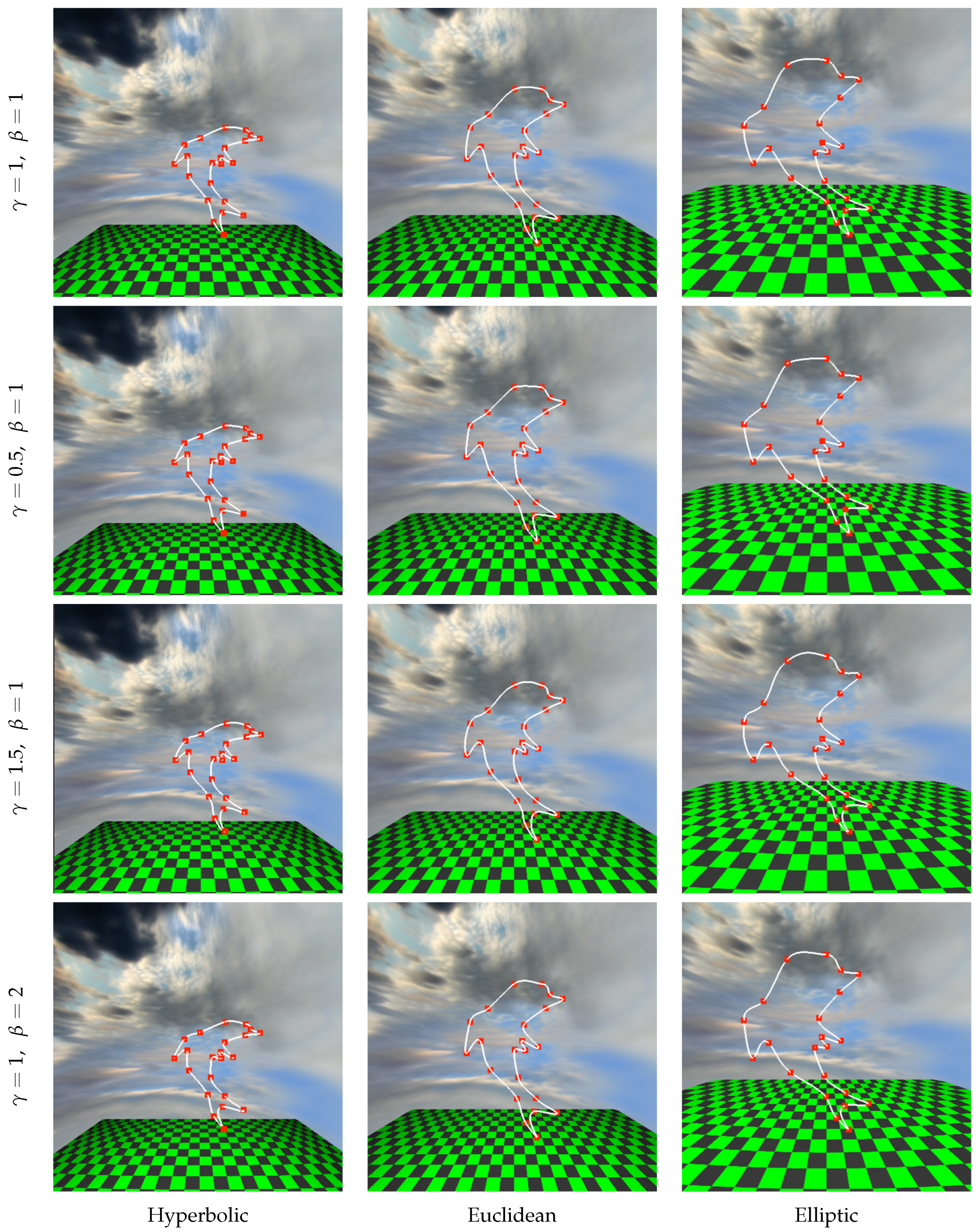 Figure 14, the control points have been placed in the 3D curved spaces, or, in other words, in the 4D embedding space, making sure that the control point also belongs to the hyperbolic Euclidean and elliptic geometry. The proposed construction guarantees that all points of the the resulting splines belong to the respective space. The spline is drawn with different tension and bias parameters to demonstrate their effect in the 3D case. As in 2D, with smaller tension parameters
