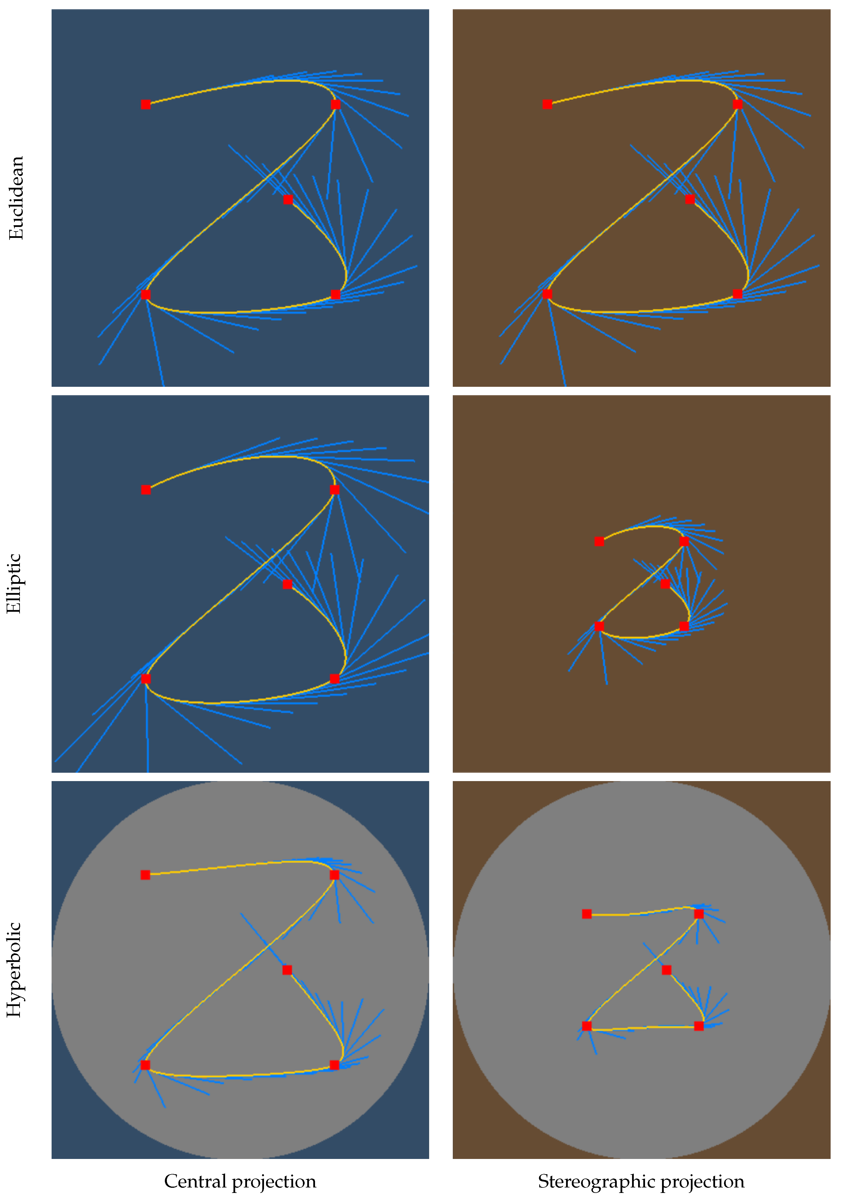 In order to demonstrate the discussed algorithms, first we compare the 2D spline curves in Euclidean, elliptic, and hyperbolic planes. To visualize the curved spaces, they are projected onto the Euclidean plane with central projection (Klein’s model) and stereographic projection (Poincaré’s model). In the case of hyperbolic geometry, the whole plane is projected to a circle that is drawn in gray. For elliptic and Euclidean geometries, the projection is infinitely large; so, only a part of the projected plane is visible here. The Klein model shows geodesics as Euclidean lines, while the Poincaré model preserves angles but presents geodesics as circular arcs.