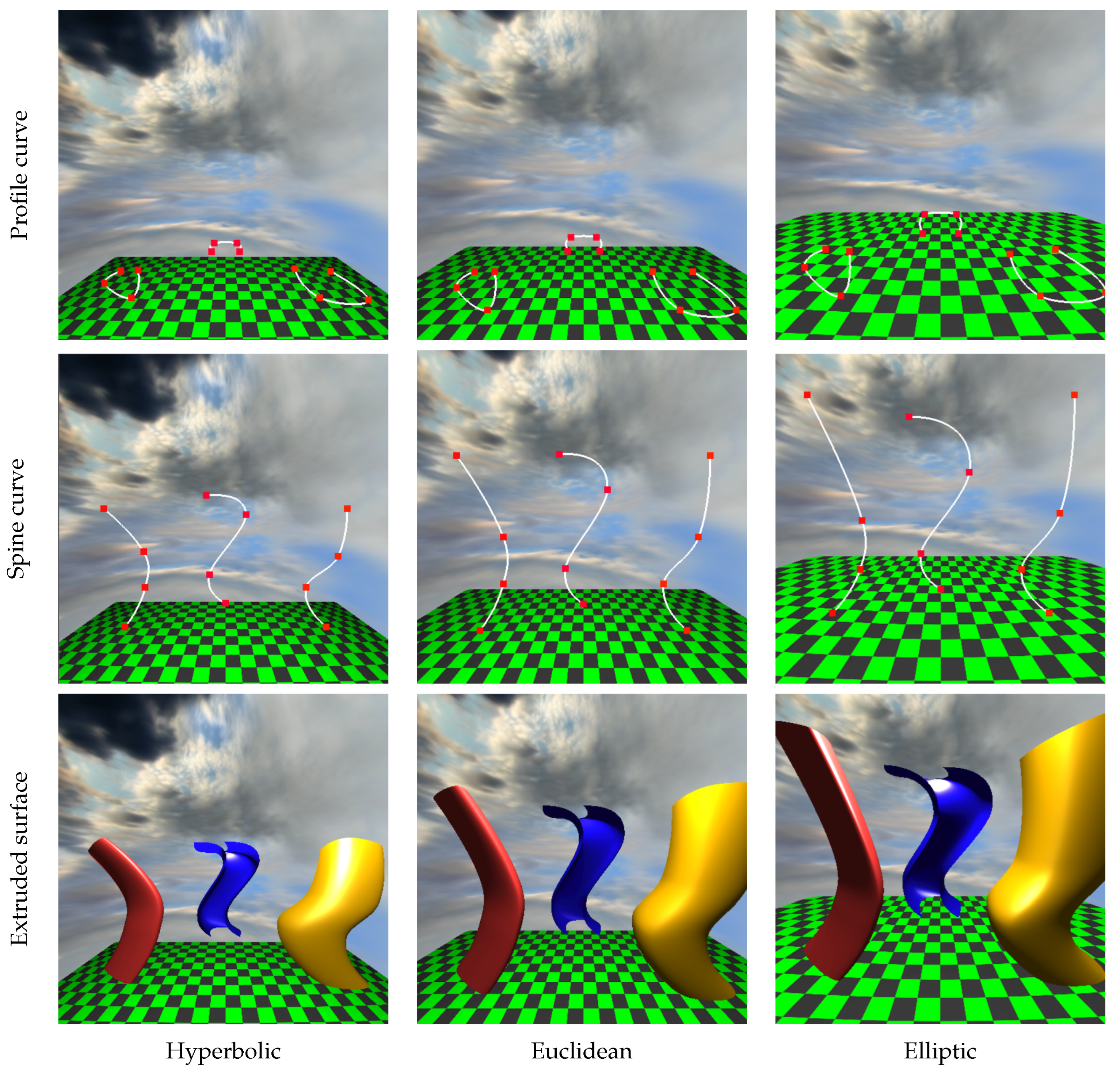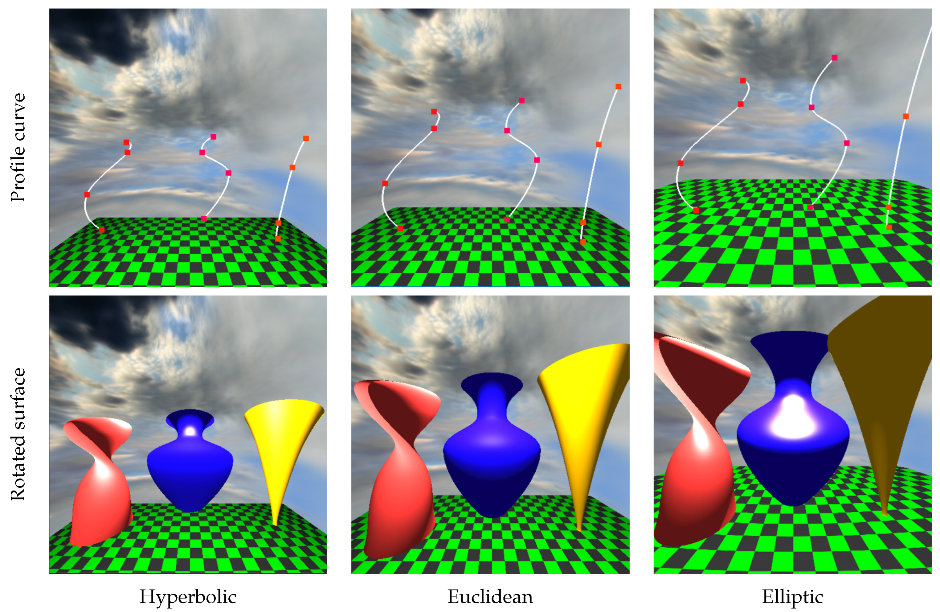 Figure 1 also follows this setting, where classical surfaces like the cone, cylinder, and the sphere are modeled as rotational surfaces. Note that in hyperbolic geometry, visibility rays diverge faster than in Euclidean geometry; therefore, objects in the hyperbolic space look smaller. In elliptic geometry, however, visibility rays diverge first, and then, they converge; thus both close and far away, objects look large. Using the analogy of the Earth, if the eye position is at the North Pole, then objects close to the North and South Poles look large, while objects close to the equator look small.