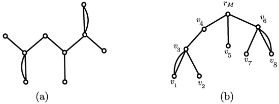 For an enumeration method, it is essential to avoid generating isomorphic graphs. To achieve this, we define a canonical representation for graphs in . This representation utilizes information about the number of vertices and multiple edges in the descendant subgraphs, as well as the number of multiple edges between the root and its children in the corresponding underlying multigraphs. Formally, the ordered representation of a multigraph is defined as an ordered multigraph in which the descendant subgraphs are arranged from left to right according to the following criteria. Consider a vertex of a multigraph and the descendant subgraphs of its children. (a) First, order the descendant subgraphs in the non-increasing order of the number of vertices. (b) More than one subgraph with the same number of vertices is further ordered in the non-increasing order of the number of multiple edges. (c) Finally, the subgraphs with the same number of multiple edges are arranged in the non-increasing order of the number of multiple edges between the root of the multigraph and the roots of descendant subgraphs. We define the canonical representation of a multigraph to be the ordered representation that satisfies (a)–(c) for each vertex. Henceforth, we assume that all graphs in are represented in their canonical form. For and , the canonical representation of a graph M is shown in Figure 7a, while the non-canonical representation of M is shown in Figure 7b.