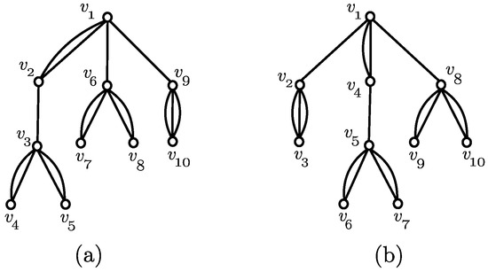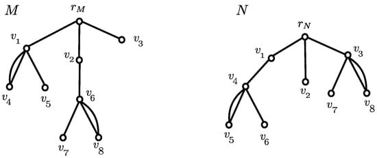 Two rooted tree-like multigraphs, M and N with roots and , resp., are defined as isomorphic when there exists a bijective mapping between their vertex sets such that if and only if , and for any two vertices , where denotes the number of edges between u and v. An example of two isomorphic graphs is shown in Figure 5.