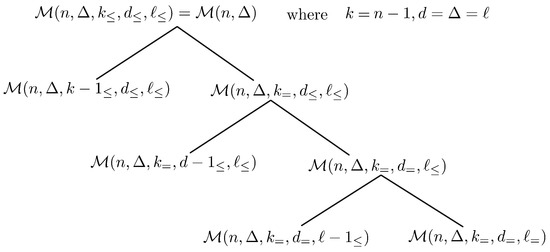 denotes the subset of consisting of rooted tree-like multigraphs with n vertices, multiple edges, and exactly k maximum number of vertices in the descendant subgraphs. According to the definition of that if and or , and if and or and In addition, we have the following recursive relation:
