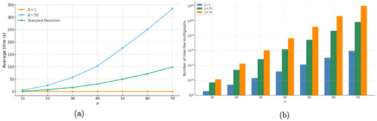 (a) Running time of the proposed algorithm for with and , along with the SD of the running time for pairs with fixed n and ; (b) number of tree-like multigraphs enumerated by the proposed algorithm for with and , along with the SD of the counts for pairs with fixed n and .