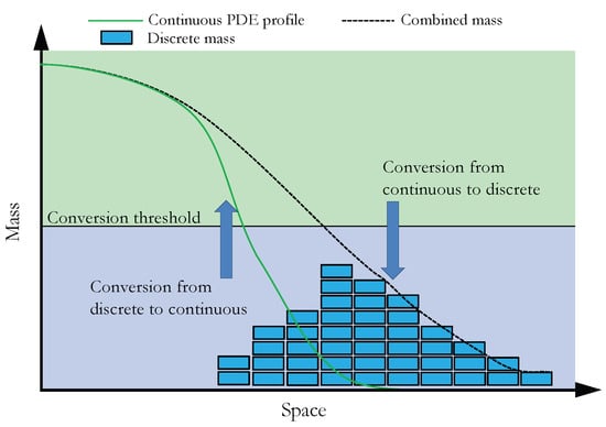 Schematic of the spatial regime conversion method. When the combined mass (black dashed line) is above the threshold (horizontal black line), mass is converted from the discrete regime (blue rectangles) to the continuous regime (green curve). When the combined mass is below threshold, mass is converted from the continuous regime to the discrete.