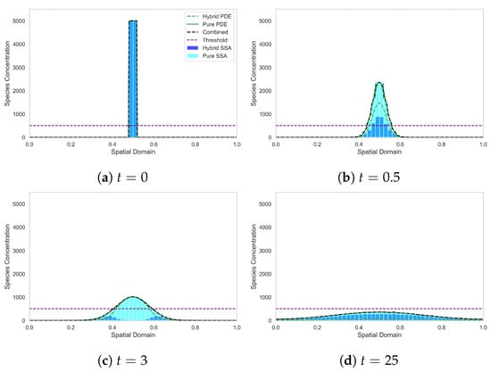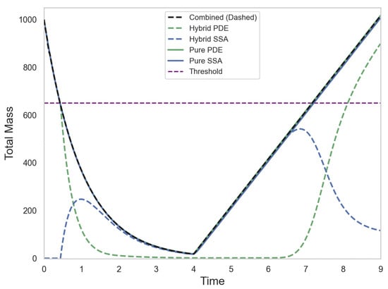 In this work, we have described and illustrated the spatial regime conversion method, an adaptive hybrid modelling approach for reaction–diffusion systems. By dynamically allocating mass to either stochastic or deterministic regimes, based on local densities, the SRCM seeks to balance the accuracy of discrete stochastic realisations with the efficiency of continuous PDE models. Unlike traditional hybrid methods, requiring predefined or fixed interfaces [17,18,19], the SRCM introduces local conversion reactions that facilitate the adaptive switching of regimes in response to evolving system states. Our simulation results demonstrate that this framework can substantially reduce computational cost while retaining key stochastic features, particularly in systems where mass varies substantially across time and space. However, while the SRCM performs well across a range of test cases, there are some subtleties to bear in mind.
