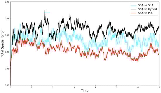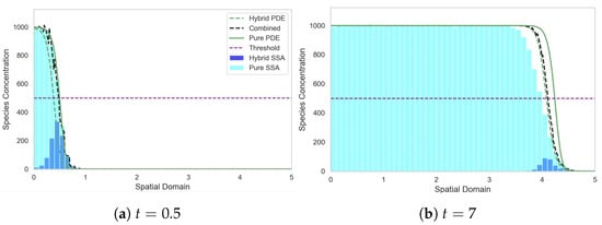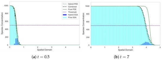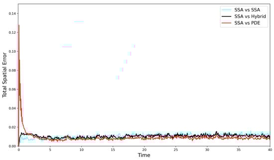 The morphogen gradient formation test problem (see Section 4.3) demonstrated the SRCM’s ability to faithfully represent a spatial profile which crosses the threshold concentration. The hybrid model closely matched both the pure SSA and PDE outcomes. However, the hybrid error here remained marginally higher than the stochastic self-error across the simulation. This artifact may be a result of the difficulty of replicating the flux boundary condition perfectly in the SRCM, leading to a small but persistent discrepancy.
