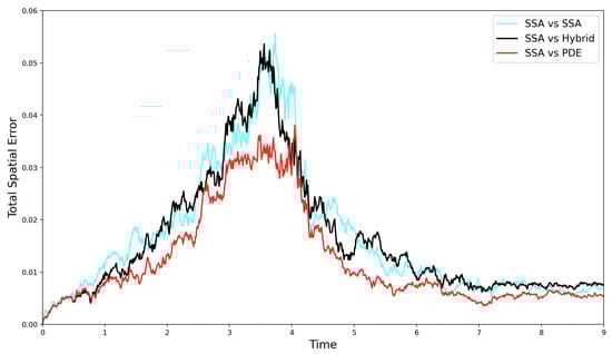 We observe that the error in the SRCM peaks early in the simulation and then settles to a level that closely matches the self-error of the SSA (see Figure 11b). This initial spike is likely due to discontinuities in the concentration profiles during the early stages of wave formation, when particle numbers are low. The sharp transitions in the hybrid conversion mechanism in regions with minimal mass likely contribute to the transient peak in error.