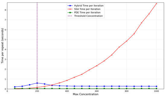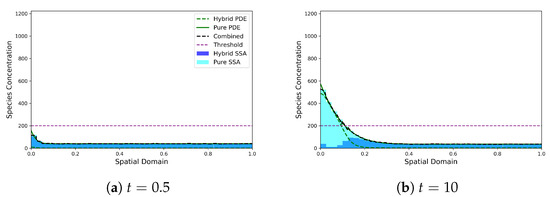 Future work will explore alternative frameworks for the threshold mechanism in the hybrid model. One potential avenue for improvement along this line is to introduce two separate thresholds at different concentration levels, rather than relying on a single threshold for both conversion reaction types. The current approach, which uses a single threshold, can lead to inefficiency due to conflicting conversions when the concentration profile fluctuates around to this conversion threshold, as illustrated in the efficiency plot (see Figure 12). By contrast, with a two-threshold system, mass would convert from discrete to continuous when the total mass was above the higher threshold and from continuous to discrete when the total mass was below the lower threshold. This would create an intermediate concentration band where no conversion occurs, avoiding contiguity between the two conversion modes and reducing the risk of fluctuation-induced back-and-forth conversion.