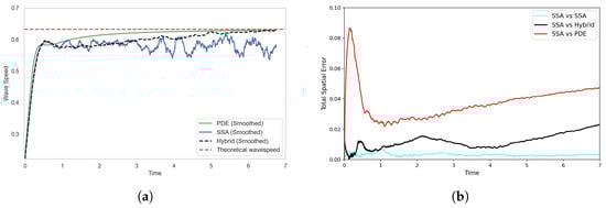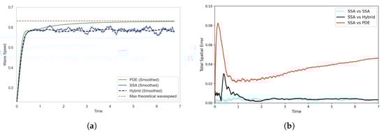 We observe in Figure 10 that there is now closer agreement between the stochastic and hybrid profiles for the adapted SRCM. Correspondingly, the smoothed wave speed of the SRCM now aligns much more closely with that of the canonical SSA simulation (see Figure 11a). This is to be expected, as the stochastic regime now dominates the dynamics at the leading edge of the wave—precisely where stochastic effects are important—allowing the wavefront dynamics to be governed primarily by the discrete stochastic model. As a result, the hybrid model captures the correct wave propagation speed of the canonical stochastic model.