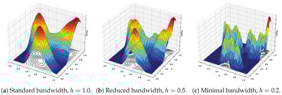 Effect of varying bandwidth values on the shape of the kernel density surface for different bandwidth choices. Red indicates the maximal possible density, dark blue corresponds to the minimal possible density, and intermediate colors represent intermediate density values.