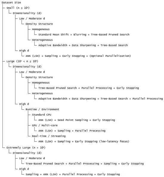 Figure 3 presents a structured decision framework that systematically aligns dataset characteristics and computational constraints with suitable acceleration strategies for Fast Mean Shift clustering. The hierarchical organization of the framework integrates key factors, including dataset size, dimensionality, density structure, and runtime environment, into a coherent decision process. By following the decision pathways, users can efficiently determine appropriate combinations of optimization techniques that balance computational efficiency and clustering accuracy, thereby reducing the need for unsystematic, trial-and-error selection of strategies. In addition, the framework explicitly delineates how distinct classes of acceleration methods—such as preprocessing, neighborhood pruning, trajectory reduction, and parallelization—can be strategically combined according to data scale and available computational resources. This systematic approach provides a practical and theoretically grounded tool that bridges methodological advances with their effective implementation in large-scale clustering applications.