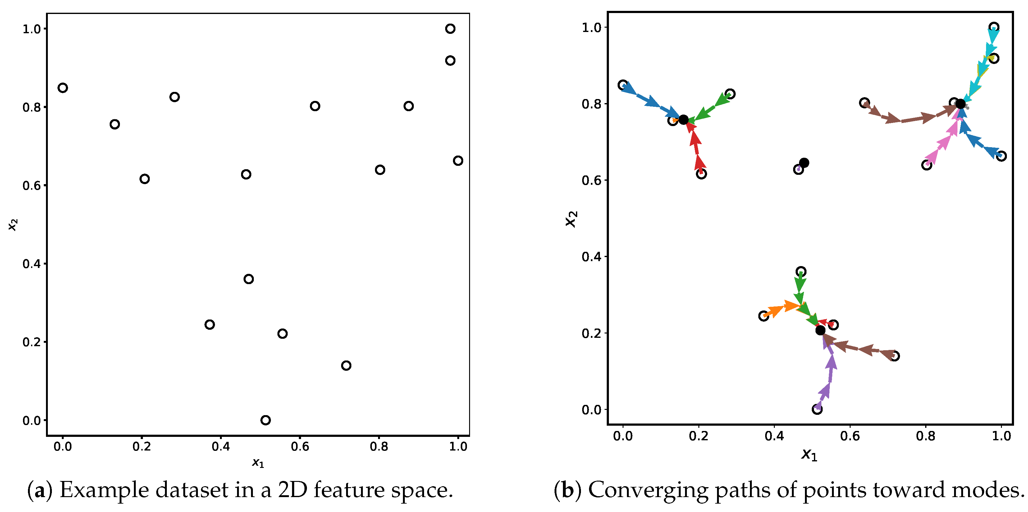 Illustration of the Mean Shift clustering process. Subfigure (a) shows the initial distribution of data points, while subfigure (b) visualizes how each point follows a unique convergence trajectory toward a mode. The trajectory of each individual point during the iterative shifting process is shown in a distinct color, illustrating how points move along different paths toward their respective local density maxima.
