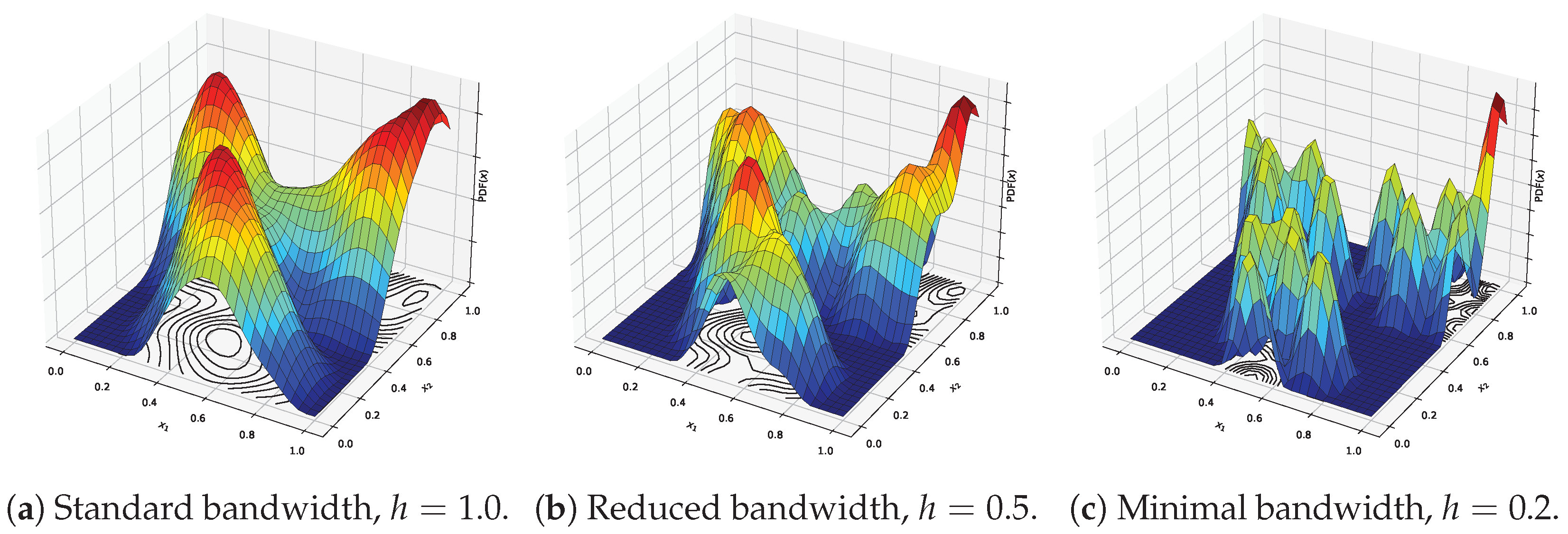 Figure 2a), the surface is smooth and captures the overall structure of the data, resulting in clearly defined and well-separated modes. As the bandwidth is reduced (