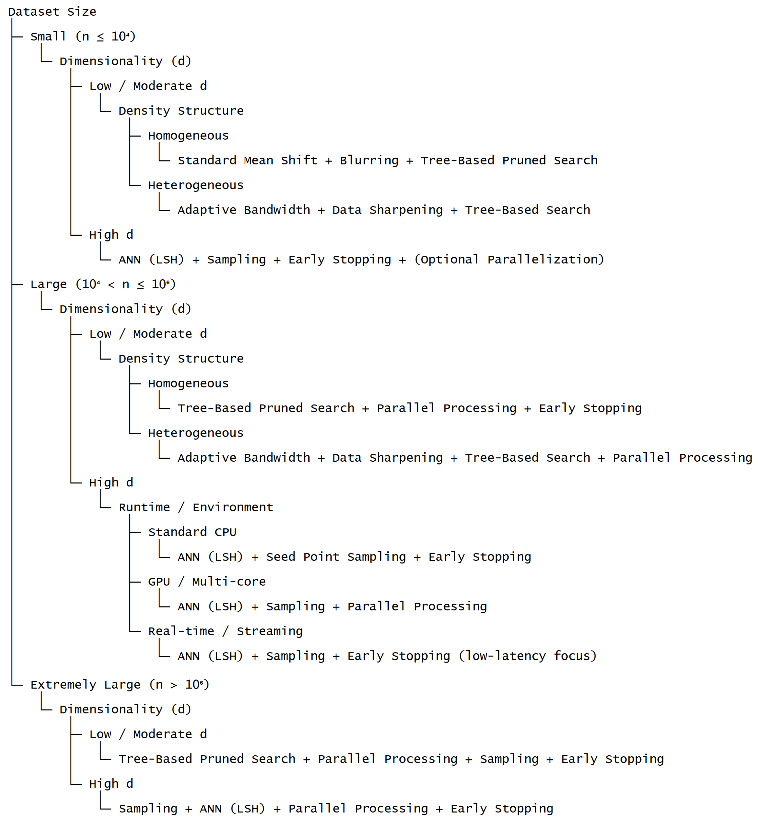 Figure 3 presents a structured decision framework that systematically aligns dataset characteristics and computational constraints with suitable acceleration strategies for Fast Mean Shift clustering. The hierarchical organization of the framework integrates key factors, including