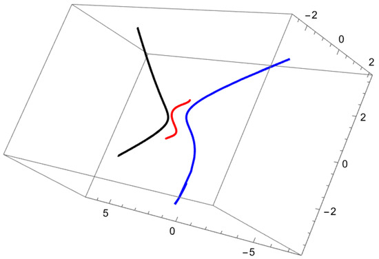 The red graph represents the main curve (), while the blue () and black () graphs illustrate the Combescure mate curves of the main curve in Example 2.