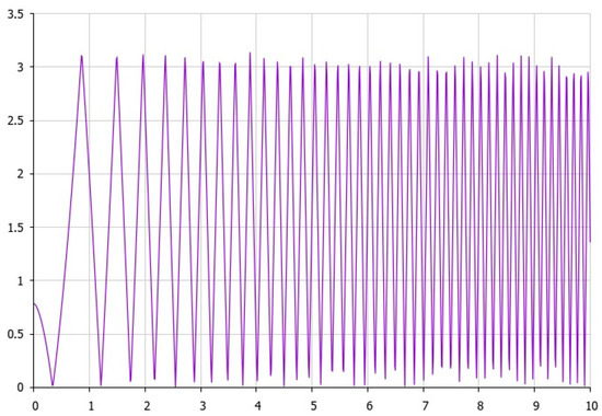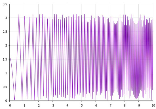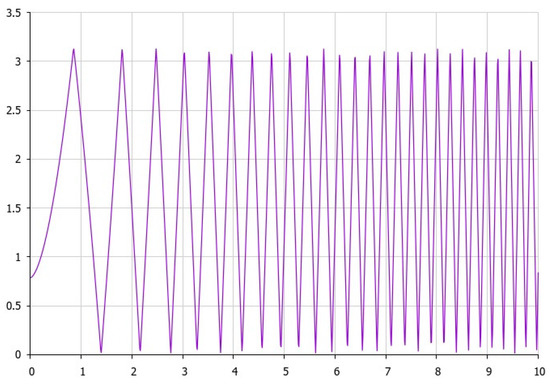 Let us investigate the simplified system of Equation (1), where we can use (as a first approximation) the expressions for the angles (14) and (16) obtained earlier from the first stage of free rotation of the asteroid outside the zone of effective attraction by the planet. Meanwhile, since angle φ characterizes the inclination of the rotation axis to the orbital plane [8], we can conclude from (16) that φ = φ(0) = 0 if we choose ψ(0) = 0 in (11) (with the aim of simplifying the presentation of the obtained partial solutions). Then, from (15), we conclude that ψ = 0 in this case, whereas expression (14) for angle θ should be given as follows: