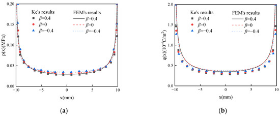 To verify the model accuracy, the piezoelectric effect was neglected, and the thermoelastic sliding frictional contact between the conductive cylindrical punch and the FGM-coated half-plane was simulated using ABAQUS 2020. In the model, the coating’s upper layer consists of zirconia (), while the lower layer (i.e., the half-plane) is composed of 6061-T6 aluminum alloy. A comparison between the finite element results and the theoretical solutions from Zhou et al. [26] is shown in Figure 5. It can be observed that the finite element results exhibit good agreement with the theoretical solutions.