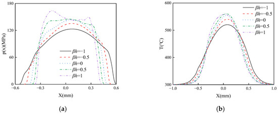 Figure 12 illustrates the influence of the friction coefficient on the thermal sliding frictional contact surface characteristics of the FGPM coating structure. As shown in the figure, the friction coefficient has a significant impact on the contact pressure, temperature, charge distribution, and electric displacement on the frictional contact surface. The maximum value of the surface contact pressure (Figure 12a) increases gradually with the friction coefficient, leading to a corresponding increase in the maximum value of the surface temperature T (Figure 12b) within the contact area. This behavior is primarily attributed to the fact that frictional heat is proportional to both contact pressure and the friction coefficient. In contrast, the friction coefficient has only a minor effect on the surface charge (Figure 12c) and surface electric displacement (Figure 12d) at both ends of the contact area.