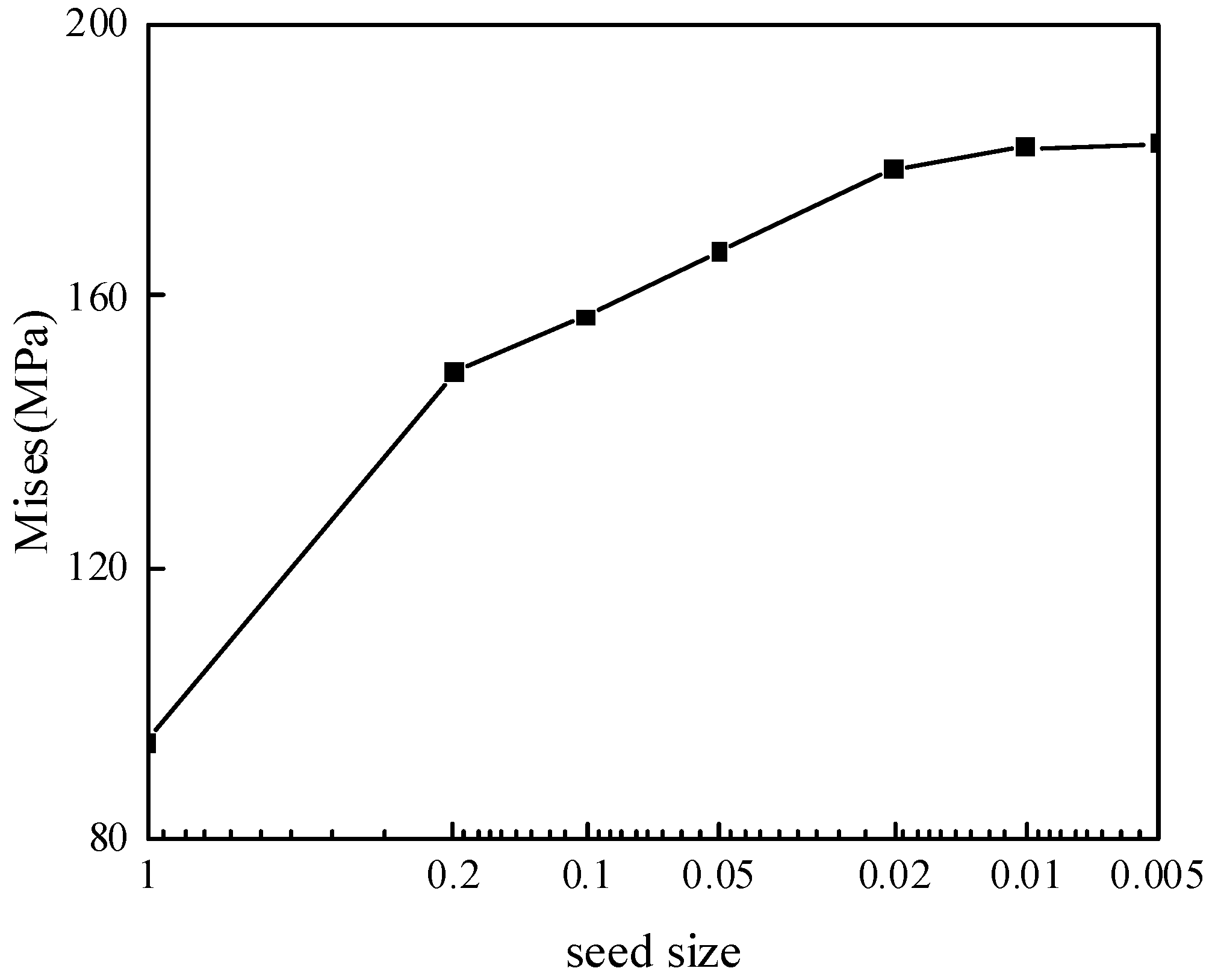 During mesh generation, a global seed size of 3 mm and a finer local size of 0.01 mm in regions of high stress concentration (the contact area) were adopted. To verify that this significant variation in seed size would not compromise the simulation results, additional post-processing analyses were conducted on the transition zone between the coarse and fine meshes.