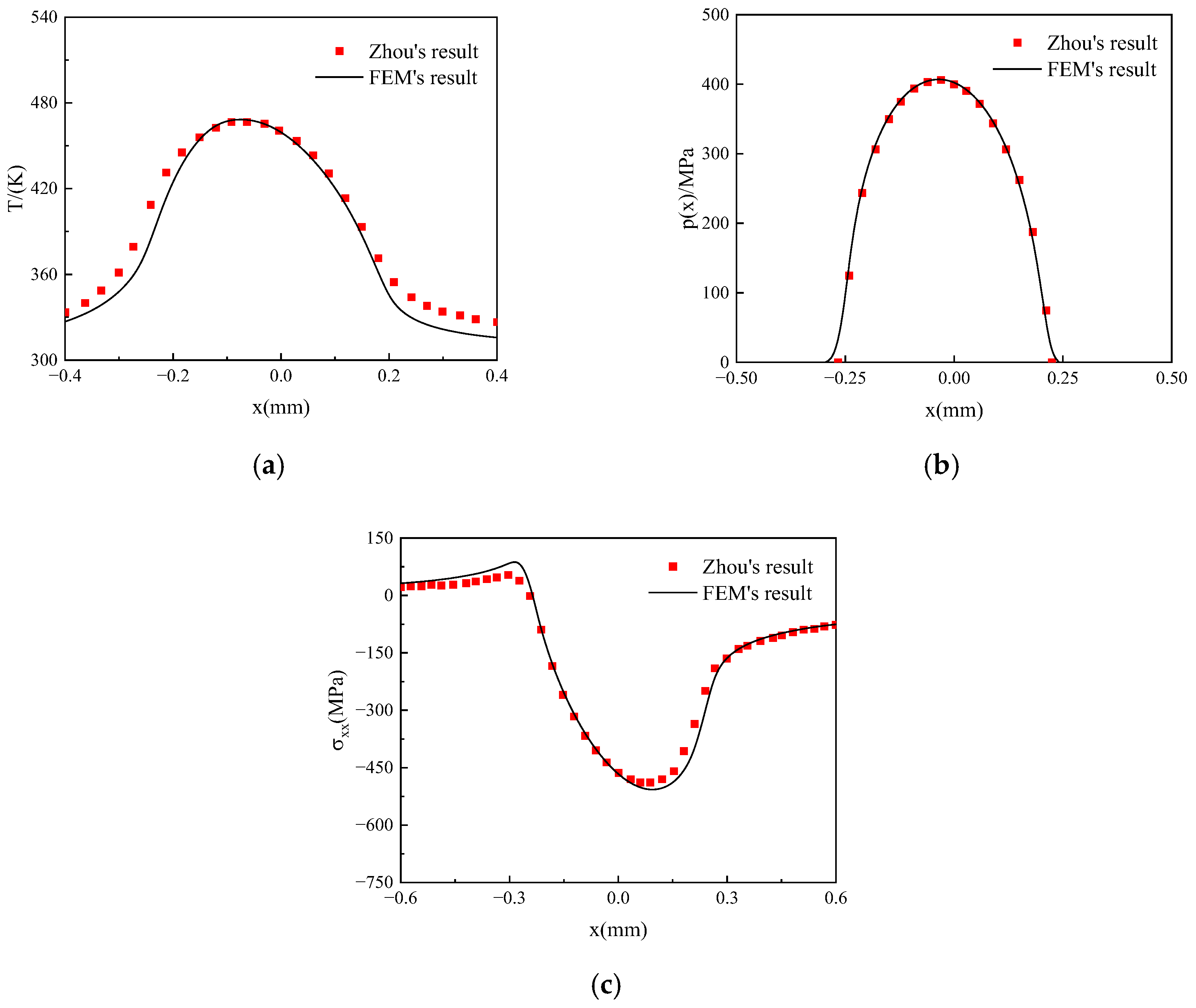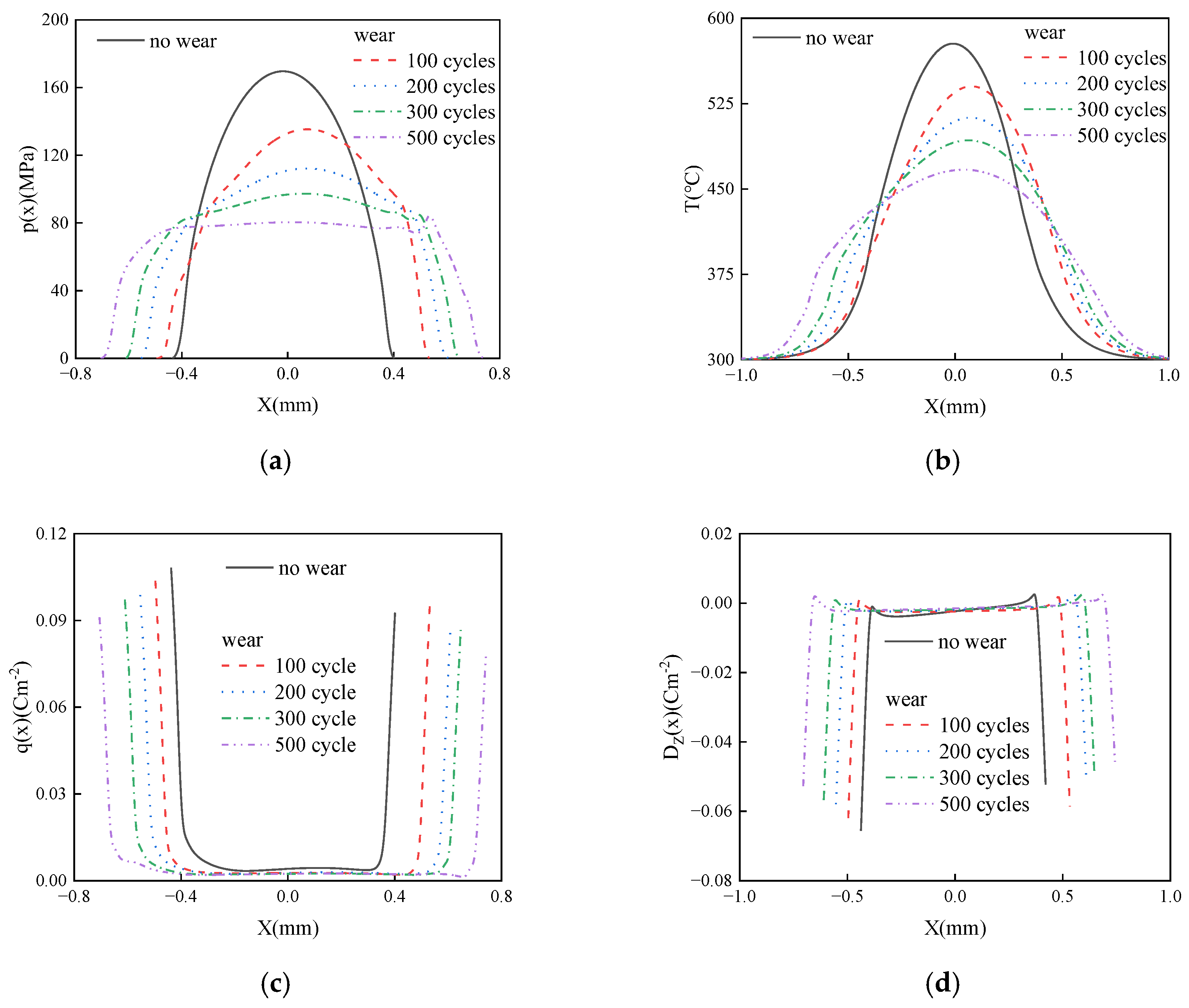 Figure 7d) when wear takes place. With increasing cycles, the distribution curves gradually become progressively smoother within the contact area. Additionally, the contact area expands gradually, whereas the maximum values of both contact stress and surface temperature decrease.