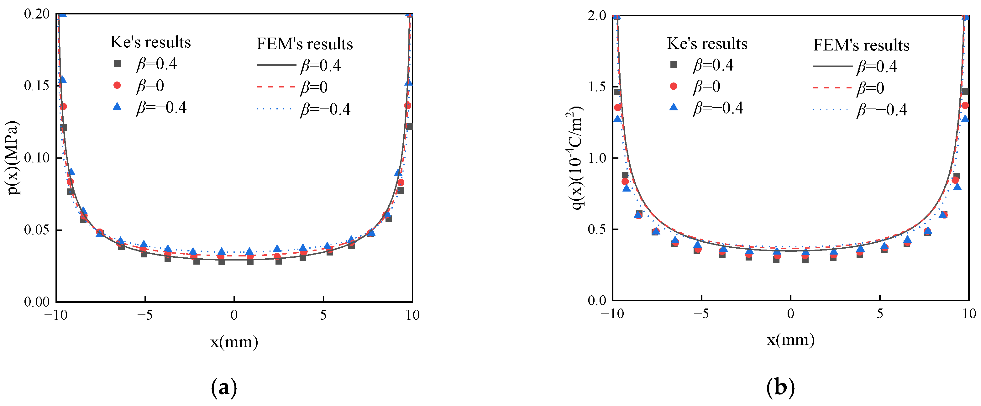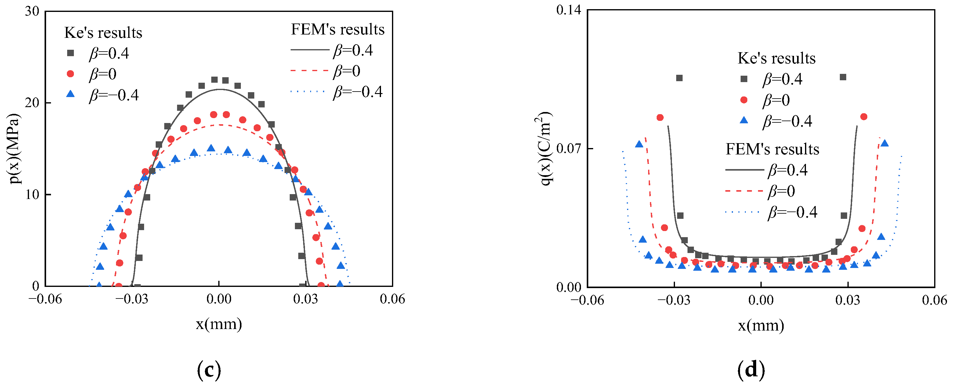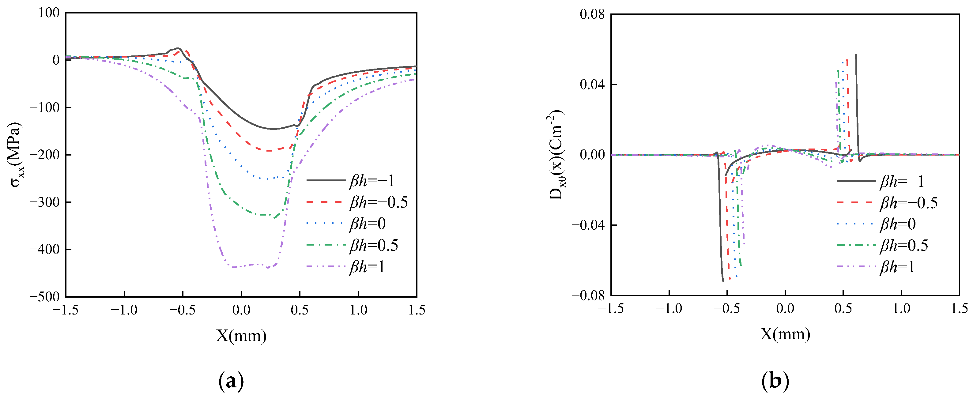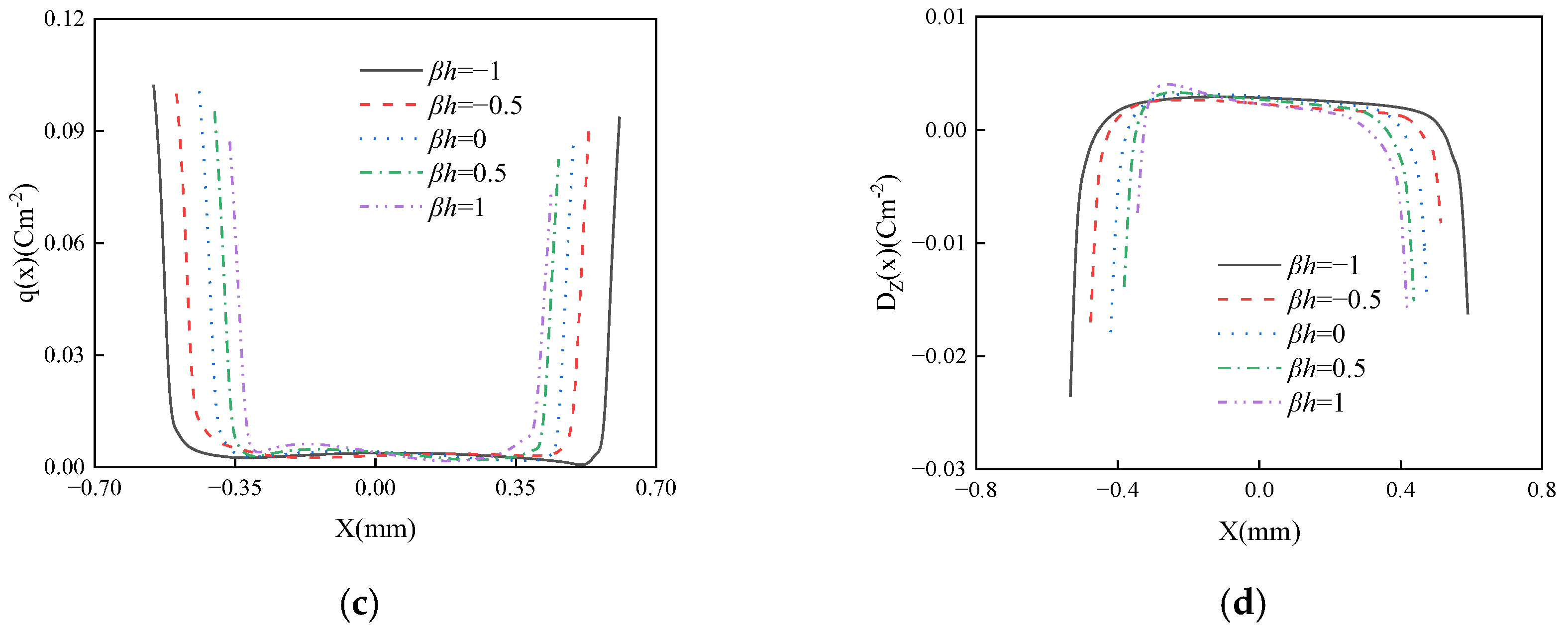 Figure 11b illustrates that the in-plane electric displacement exhibits singularity at the edge of the contact area, and its maximum value gradually decreases as