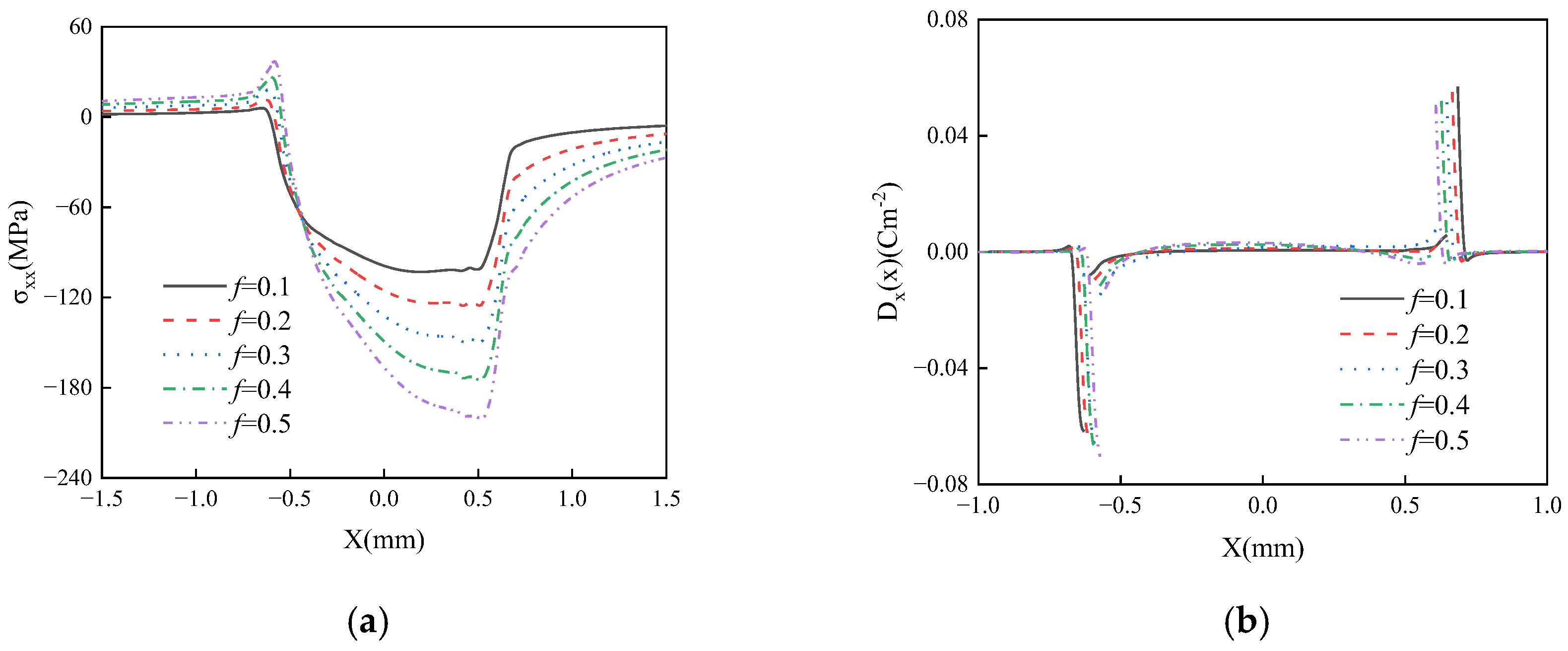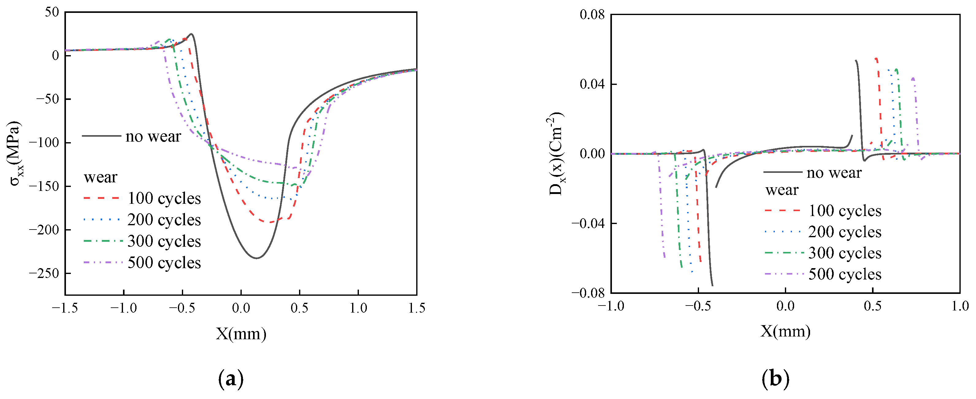 Figure 13b). With increasing friction coefficient, the maximum tensile stress and the maximum electric displacement at the trailing end of the contact area increase, while the maximum compressive stress within the contact area also gradually increases. These numerical results demonstrate that reducing the friction coefficient can effectively decrease the maximum tensile stress and electric displacement at the trailing end of the contact area, thereby alleviating the thermo-electrical coupled sliding frictional contact damage of piezoelectric materials.