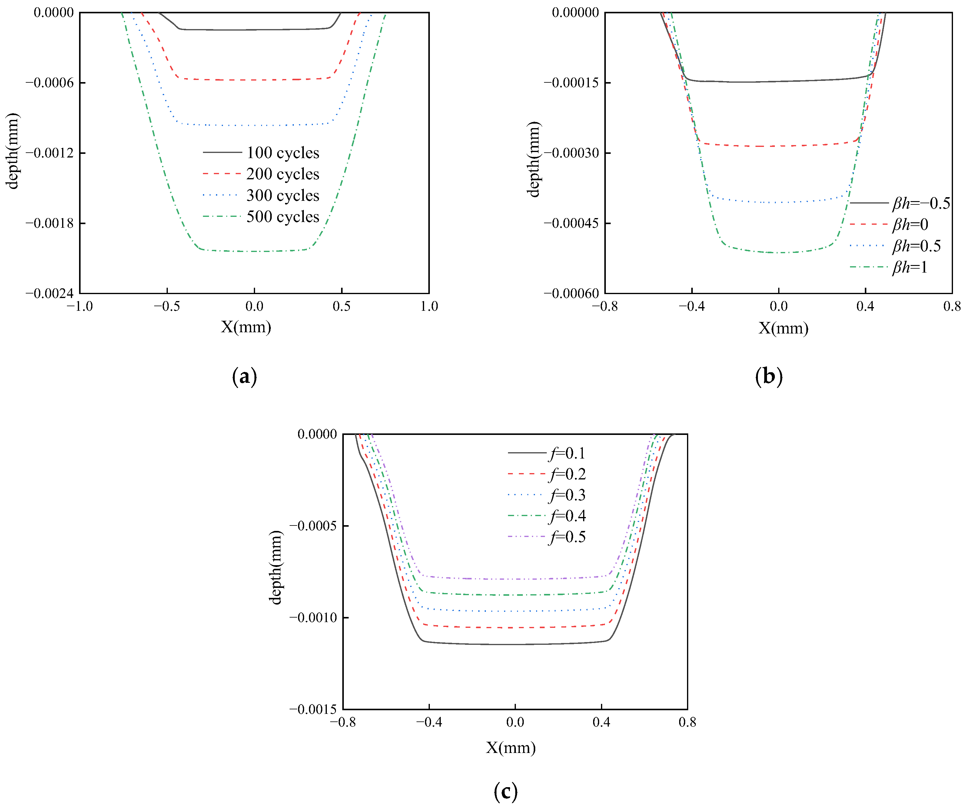 Figure 9b illustrates the effect of the gradient index: an increase in the gradient index leads to greater wear depth but a smaller worn area. This phenomenon is primarily attributed to the enhanced surface hardness associated with a higher gradient index, which concentrates contact stress more intensely in the central region and thereby exacerbating localized wear. In addition, the depth and width of the wear gradually decrease with the increase in the friction coefficient (