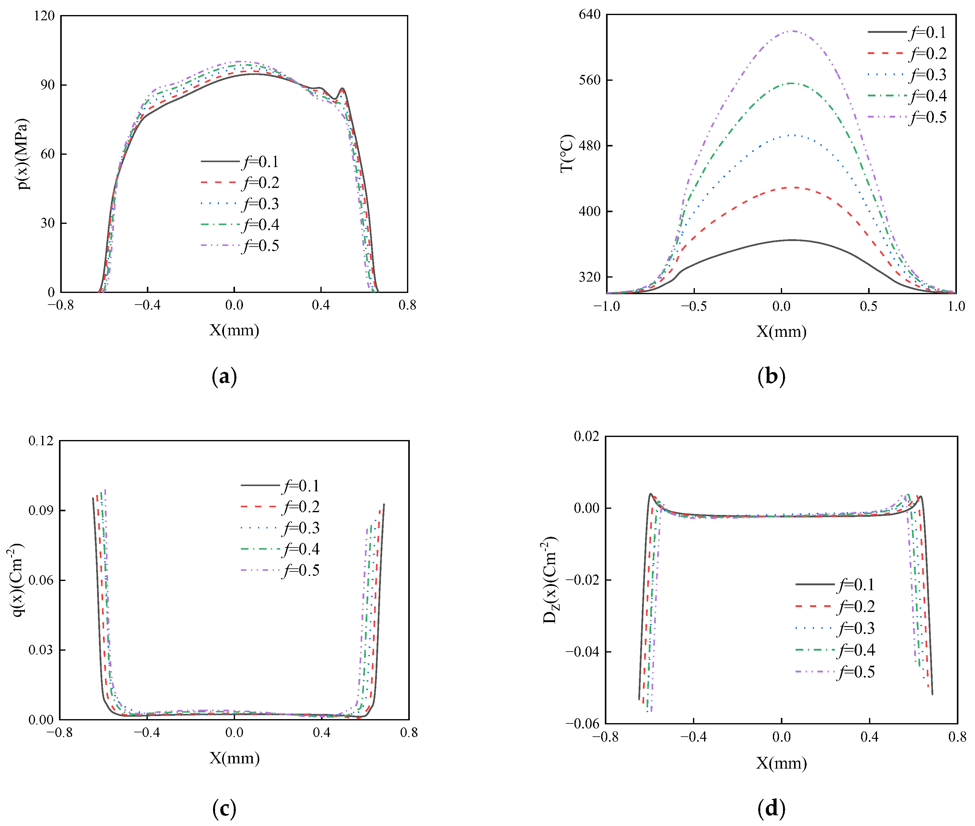 Figure 12b) within the contact area. This behavior is primarily attributed to the fact that frictional heat is proportional to both contact pressure and the friction coefficient. In contrast, the friction coefficient has only a minor effect on the surface charge
