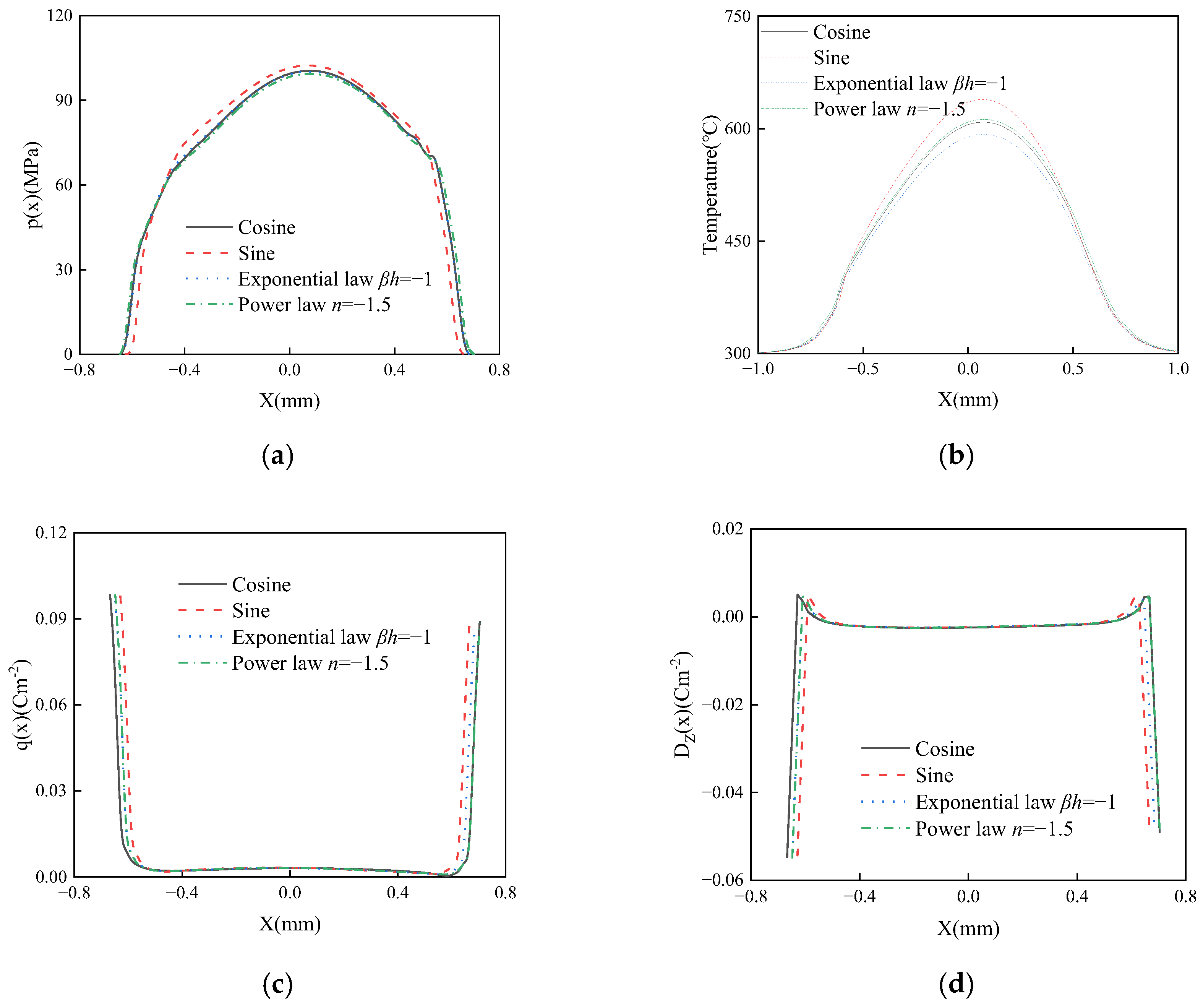 Table 4. These numerical results demonstrate that optimizing the gradient variation form of the coating material can effectively reduce surface contact pressure and surface temperature, as well as controlling the maximum surface tensile stress, which is highly valuable for the design of high-performance piezoelectric material coatings.