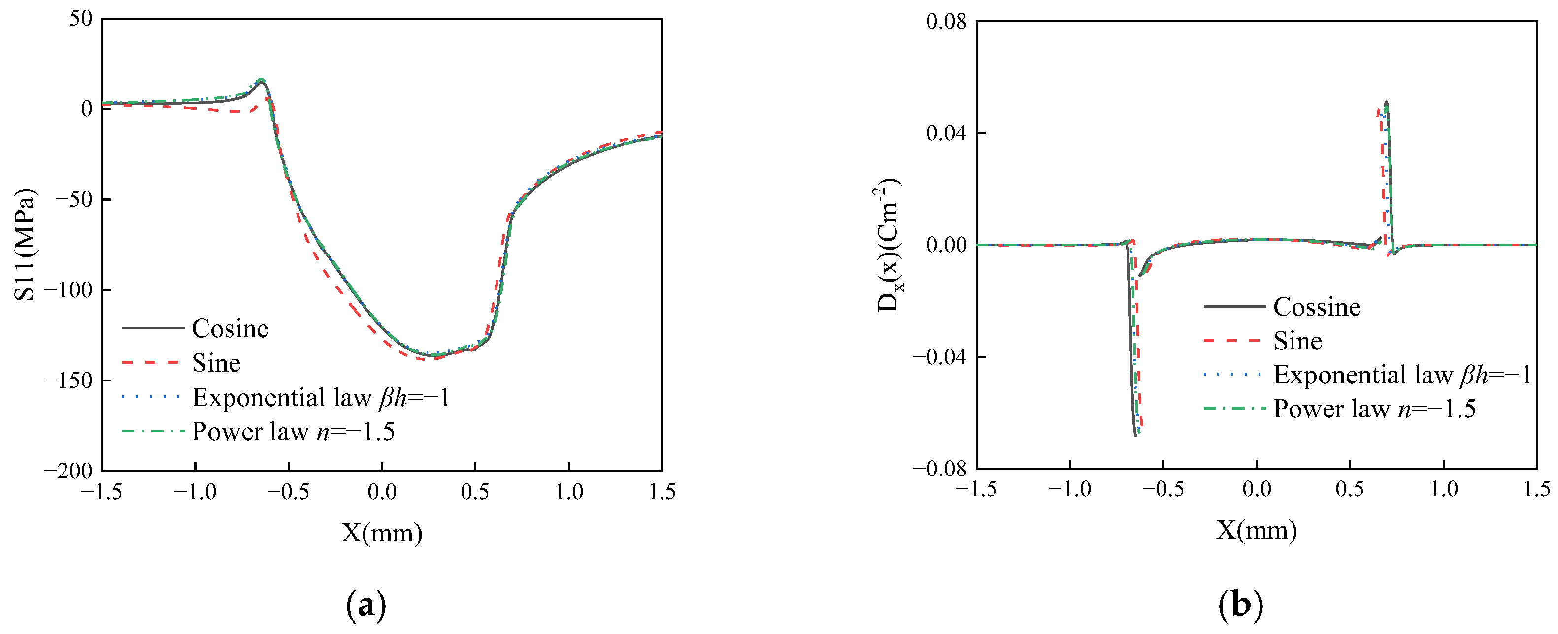 Figure 13 presents the influence of the friction coefficient on the in-plane stress and in-plane electric displacement of the FGPM coating structure. As shown in the figure, the friction coefficient exerts a considerable influence on both the in-plane stress