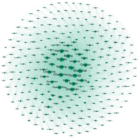 This study constructs an urban economic space correlation matrix based on the gravity model and uses a 0–1 matrix to build the economic spatial correlation network for 266 cities from 2008 to 2020. Through this analysis, the aim is to visually demonstrate the development trends of the urban economic space structure of China’s 266 cities between 2008 and 2020. Due to space limitations, this study does not present the urban economic space correlation network diagrams for each year from 2008 to 2020. Instead, the network diagram for 2020 is chosen as an example to illustrate the urban economic spatial correlation network.