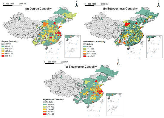 The spatial distribution of degree centrality, betweenness centrality and eigenvector centrality in 2020.