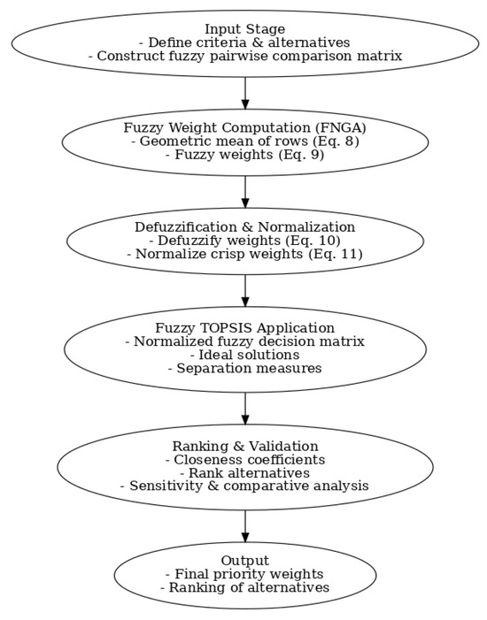 In this section, we present the proposed extension of the fuzzy hierarchical TOPSIS integrated with the analytic network process (ANP). The methodology aims to capture interdependencies among criteria while addressing the limitations of classical TOPSIS in handling fuzziness and subjectivity. To enhance clarity and reproducibility, the mathematical formulations are presented step by step with explanatory notes. A flowchart summarizing the overall procedure is also provided (Figure 2).