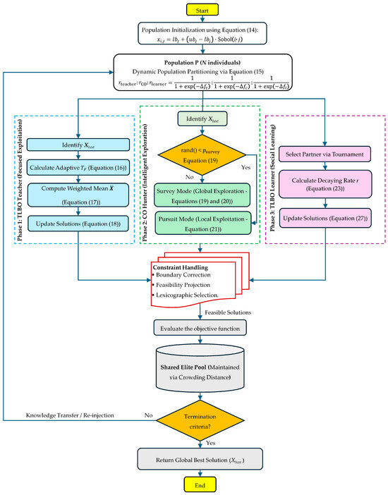 As demonstrated in Figure 1, the structure of the algorithm consists of three parallel optimization streams, each with a distinct search behavior, while concurrently engaging in continual, coordinated information sharing. The TLBO Teacher Phase provides specialized exploitation with gradient-informed mechanisms to refine solution quality in promising areas. Meanwhile, the CO Hunting Phase induces intelligent exploration with biological motifs, vigorously sieving through the search territory for new optima. A joint elite pool acts as an anchor knowledge repository, facilitating dynamic information sharing amongst these phases. This pool is moderated with a crowding distance criterion to ensure population diversity and prevent premature convergence. This dual process of competitive exclusion and cooperative learning ensures an effective balance between global exploration potential and local exploitative precision.