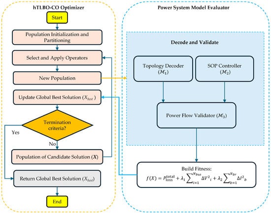 The remainder of the paper is organized as follows: Section 2 describes the mathematical modeling of the SOP-integrated network reconfiguration problem. Section 3 presents the hTLBO-CO algorithm. Section 4 provides the implementation platform of combining the optimizer with the power grid model. Section 5 offers simulation results and discussions on IEEE test networks with comparisons with other algorithms. Finally, Section 6 concludes the paper, with significant contributions and future research directions.