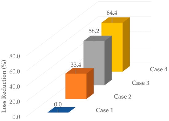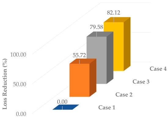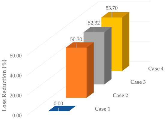 For the IEEE 119-bus test system of Case 2 (determination of DNR alone), hTLBO-CO provided a total loss of 645.09 kW, and a loss reduction of 50.30% relative to the base case. This is considerably higher than all the competitive techniques, whose solutions are typically convergent to levels in the order of 850–867 kW (33–34% loss reduction). Compared to the best solution of the competitor (ARO: 851.01 kW, 34.36%), loss reduction was enhanced by over 15 percentage points. The minimum voltage of 0.9323 p.u. is comparable to that of the other techniques, albeit slightly lower than ARO’s best solution of 0.9412 p.u.