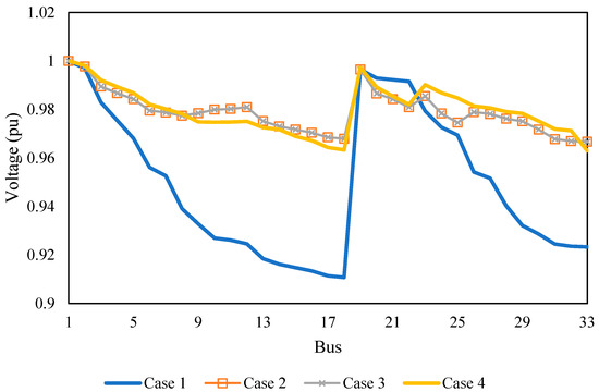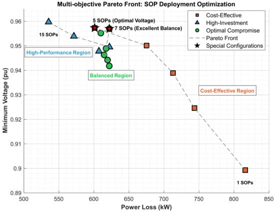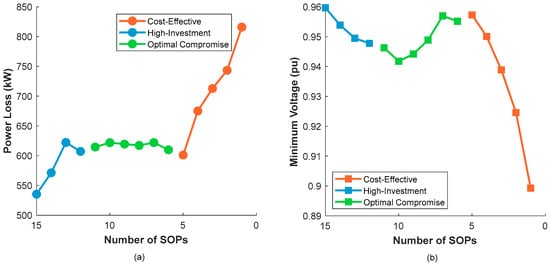 Three areas of operation were identified by the Pareto front analysis, with varying performance–cost compromises (Figure 14 and Figure 15). The area of high investment (12–15 SOPs) ensures improved technical performance, with power losses of 535.37–622.22 kW and voltage levels always higher than 0.9478 pu, but at high infrastructure investment costs. The most suitable compromise region (6–11 SOPs) is the preferable performance–cost trade-off region, where the losses range from 601.10 to 622.06 kW and voltage profiles range from 0.9418 to 0.9570 pu. This region offers system planners practical operating conditions where substantial cost savings are achievable with tolerable and acceptable performance degradation. The economic area (1–5 SOPs) is economically beneficial with decreased capital investment, albeit with substantial technical trade-offs. These are most pronounced in voltage stability, where the minimum voltage dropped to 0.8993 pu and losses increased considerably to 675.16–816.01 kW.