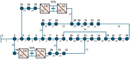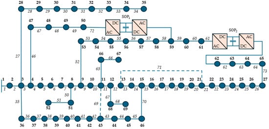 where represents total system power losses, is the total number of branches, denotes branch resistance, and are active and reactive power flows in branch , and is the voltage magnitude at the sending node of branch . indicates the operational status (1: closed, 0: open) of the b-th branch. This expression of quadratic loss integrates conductor heat losses and the losses of the transformer’s copper, with the results being a nonconvex optimization environment highly susceptible to reactive power flows with SOP operation.