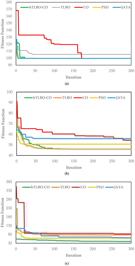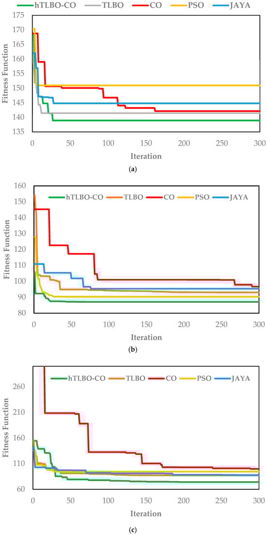 To justify application of the proposed hTLBO-CO algorithm to a wider range of problems, it should be compared to the currently existing state-of-the-art metaheuristic techniques reported in the open literature. While comparison of hTLBO-CO with four existing well-known algorithms (TLBO, CO, PSO, and JAYA) was made in the above subsections, they do not collectively represent all the presently used advanced optimization techniques for redefining distribution networks. The comparison with existing techniques, given in Table 15, for instance, ITS [34], MTS [35], FWA [36], CSA [37], HAS [38], FA [39], SFS [40], SSOE [41], MSSOE [42], CGA-ISP [43], and ARO [44], indicates a stricter justification of the method’s efficacy and ensures a fair comparison.
