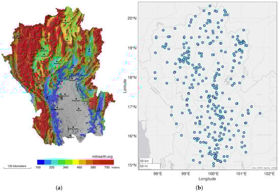 Our domain of study is located in the northern region of Thailand, which lies between latitudes 14°56′17″–20°27′5″ North and longitudes 97°20′38″–101°47′31″ East, covering 17 provinces with an area of 172,277 km2. The northern region of Thailand can be divided into upper and lower parts. Topographically, see Figure 1a (adapted from www.mitrearth.org), the upper north is characterized as a mountainous zone, dominated by north–south oriented ranges. Between these ranges lie fertile intermontane basins and river valleys, which give rise to four principal tributaries (Ping, Wang, Yom and Nan) that form the headwaters of the Chao Phraya River in central Thailand. In contrast, the lower-north region serves as a transition zone between the rugged highlands of the upper north and the flat central plain, characterized by broad river valleys and extensive floodplains.