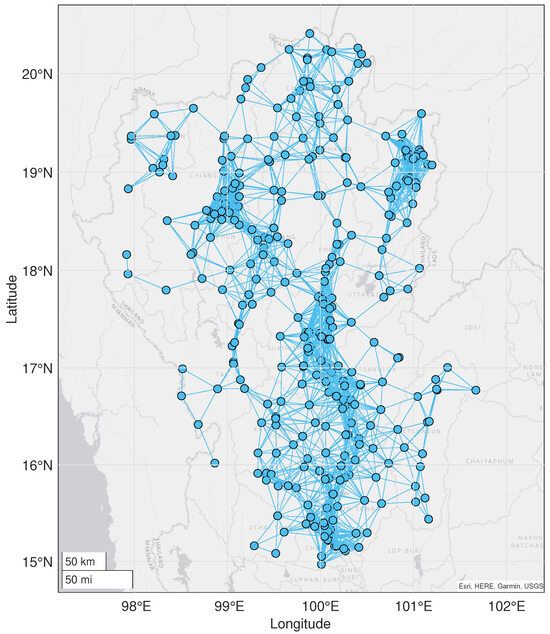 In this framework, each station’s location is modeled as a node of the graph, represented by , where S is set of all stations and is set of all edges between them. An undirected edge is established between any pair of stations if their separation distance is less than a predefined threshold, which is the minimum distance allowing all stations in our study to form a connected graph. The minimum predefined threshold to create the graph G in our study area is , which is demonstrated in Figure 2.