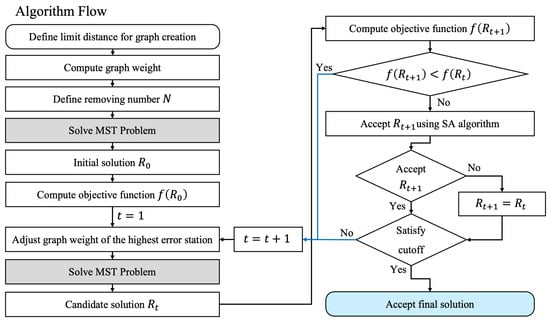 To accomplish the station selection objective, there are various stopping criteria that can be applied, such as terminating the process after obtaining the same solution for consecutive iterations, or halting the procedure after a predetermined number of repetitions. In this study, the stopping condition is based on the number of iterations. That is, the process is terminated after predefined iterations of step . Algorithm 2 illustrates the workflow of the entire process for finding the optimal station selection in the network and the flowchart of Algorithm 2 is provided in Figure 3.