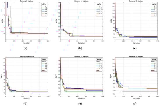 To assess the effect of centrality on the optimization process, as defined in Equation (14), the trade-off parameter is varied from 0 to 1 with an increment of 0.2. With the cooling rate fixed at , we examine the convergence of the SA optimization in achieving the local optimal AKV for specific numbers of excluded stations with , and 30. For the purpose of clarity in presentation, six values of the parameter are considered for each N, as displayed in Figure 4.