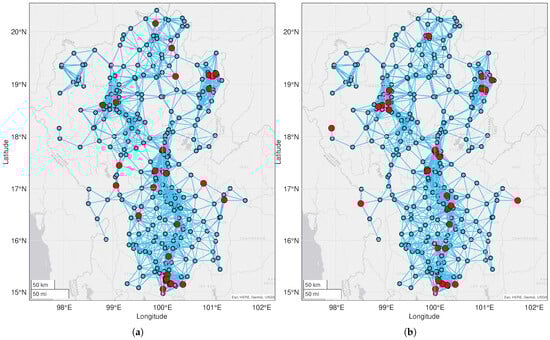Spatial distribution of the remaining stations (blue nodes) with 30 removed stations (red nodes) at for different values of trade-off parameter (a) centrality-integrated case, , and (b) no-centrality case, .