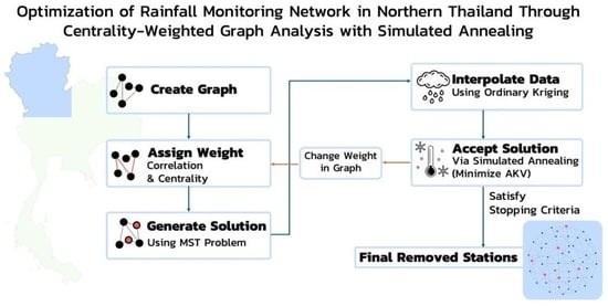 The primary objective of this research is the augmentation of the SA optimization technique through the integration of the graph theory, with the AKV serving as the objective function. In the preprocessing stage, potential station removals are determined via the minimum spanning tree (MST) problem, where the importance of each station within the network is assessed using graph-theoretic weights. Instead of relying solely on correlation coefficients to compute these weights, we incorporate centrality analysis by including both the clustering coefficient and betweenness centrality. The clustering coefficient quantifies the local interconnectedness of node’s neighbors, whereas the betweenness centrality measures the frequency with which a station appears on the shortest paths between other nodes in the network. To evaluate performance, monthly rainfall data from 317 stations across Thailand over the period 2012–2022 were employed, with 9 years (2012–2020) allocated for training and 2 years (2021–2022) for validation.