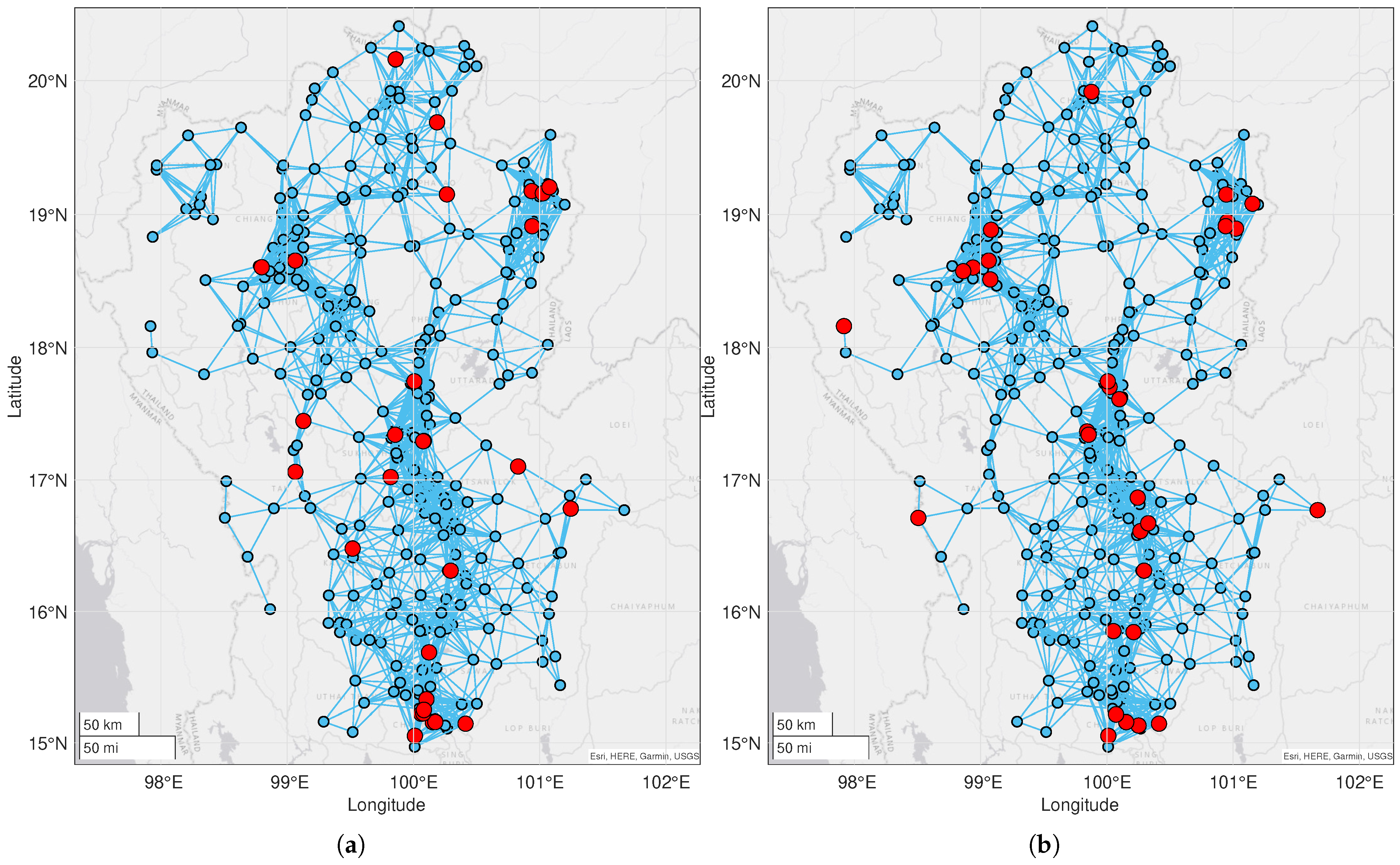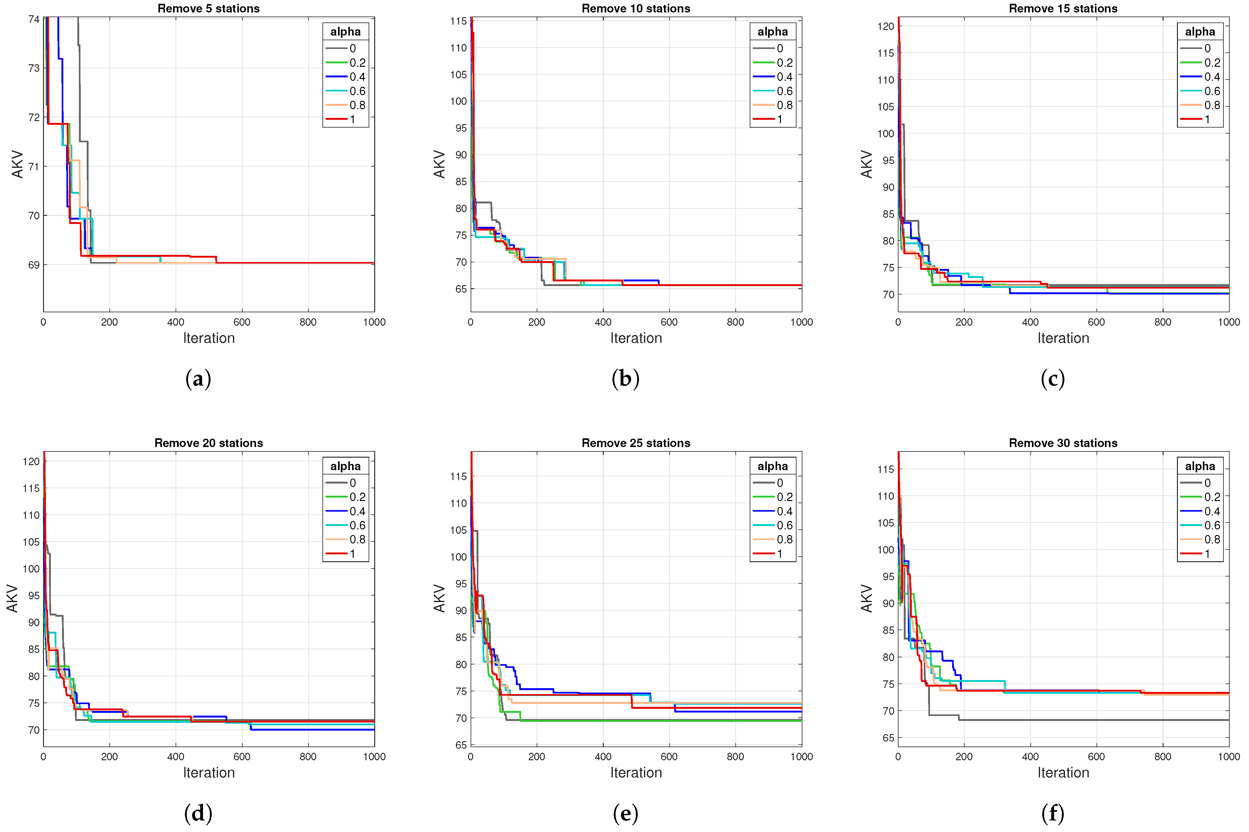 Figure 5b), the removed stations tend to cluster in the central part of the map, with additional removals occurring at locations distant from these clusters. To ensure a well-distributed coverage of the monitoring stations across the study area, the trade-off parameter other than