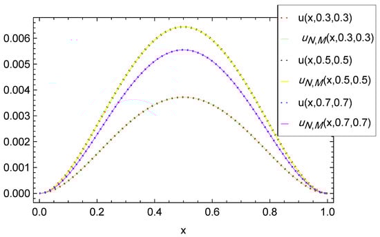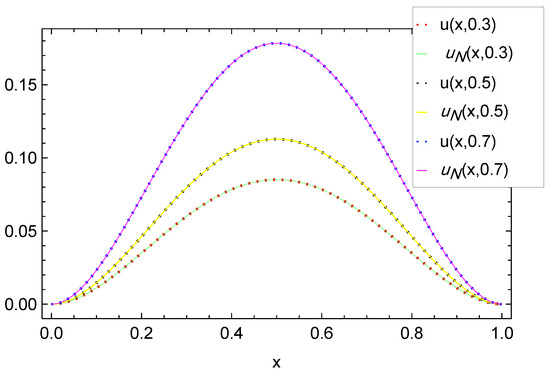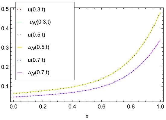 In Table 1, we report the maximum absolute errors generated by applying the proposed algorithm to Example 1. Figure 1 displays the approximate solution for the chosen case . For selected points within the domain, Figure 2 illustrates the absolute error along the -plane. Figure 3 and Figure 4 demonstrate excellent agreement between the numerical approximation and the exact solution . Figure 5 and Figure 6 show the corresponding absolute errors along the t- and the x-direction, respectively. The convergence decay curve in Figure 7 confirms the exponential and rapid convergence of the proposed method. As the number of collocation points N increases, the error decreases exponentially, which aligns with the smoothness of both the exact solution and the Romanovski–Legendre basis functions. Consistent results across all parameter sets further verify the accuracy and stability of the two-stage spectral collocation formulation for smooth problems.