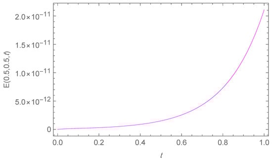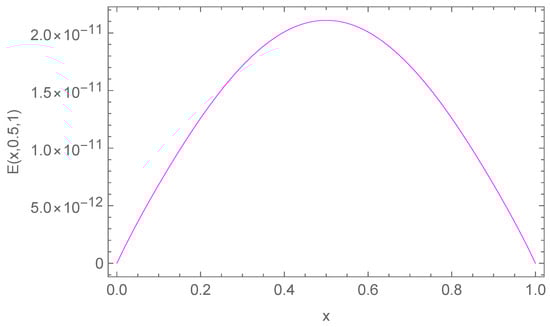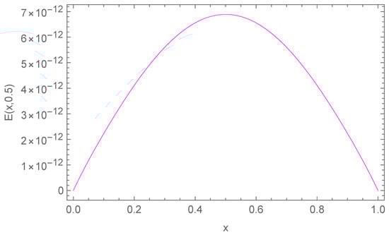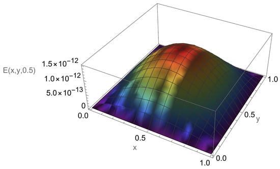 In Table 2, we present the maximum absolute errors obtained for Example 2, alongside the corresponding results from the Crank–Nicolson ADI Galerkin spectral method (CN-ADI-GSM) reported in [30]. Figure 8 illustrates the approximate solution for the chosen parameter set . The numerical solution closely matches the exact solution at selected points of y and t as shown in Figure 9. The associated absolute errors are depicted in Figure 10, Figure 11 and Figure 12 for the -plane, the t-direction, and the x-direction, respectively. The convergence decay curve in Figure 13 confirms the spectral accuracy of the method.