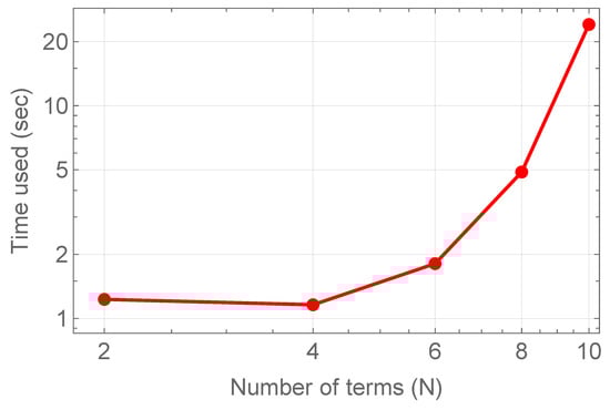 To further evaluate the performance of the proposed Legendre–Romanovski spectral collocation method, we analyzed the processing time based on the number of terms used in the approximate solution. In both the one- and two-dimensional cases, the approximate solution is expressed as a summation of orthogonal basis functions. A key advantage of this representation is that highly accurate results can be obtained with only a small number of terms, which significantly reduces the computational effort compared to many conventional approaches.