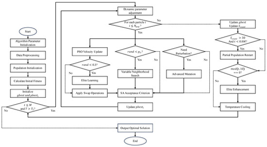 In order to clearly illustrate the implementation details of the Particle Swarm-guided hybrid Genetic–Simulated Annealing algorithm (PS-GSA) proposed in this study, its detailed algorithmic step-by-step description with pseudo-code is provided below. Unlike traditional meta-heuristic algorithms, PS-GSA organically integrates the global guidance ability of discrete Particle Swarm Optimization (PSO), the local mining ability of Variable Neighborhood Search (VNS), and the probabilistic jump-out mechanism of Simulated Annealing (SA).